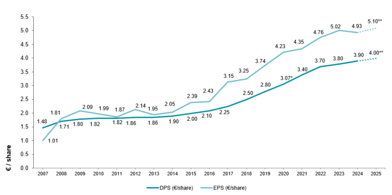 * Prorata of the €4.60 dividend (18 months) over 12 months.